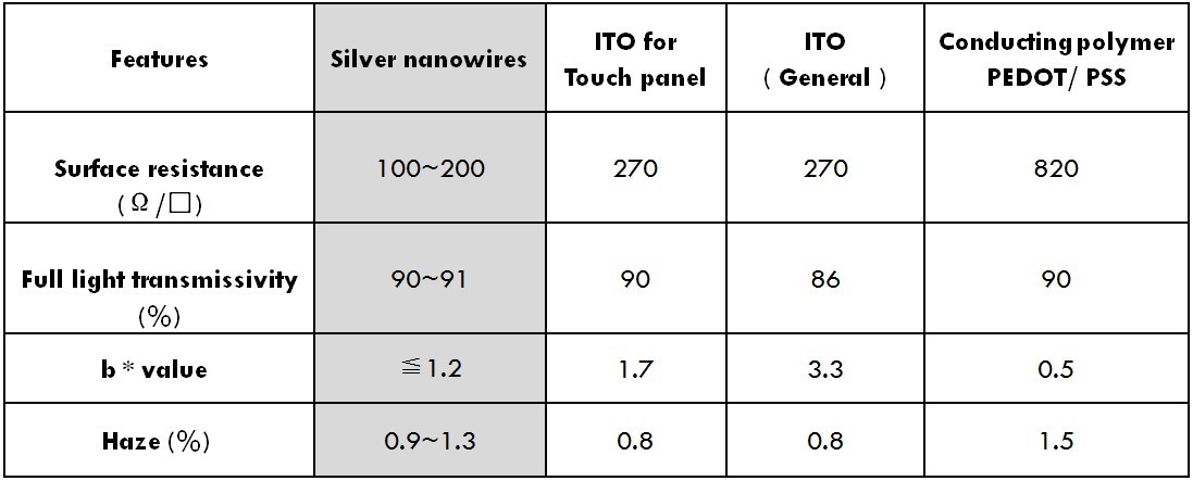 The good performance of mixed usability, which can be applied to recent industrial processes; the stability of material reduces the time required to industrial processes, in addition, it has more favorable environment for reliability and related properties. Silver nanowires transparent conductive film has a wide range of applications, which covers the touch panel, display, flexible display and solar, etc. Obviously, it is the best alternative material choice to indium tin oxide (ITO) film.