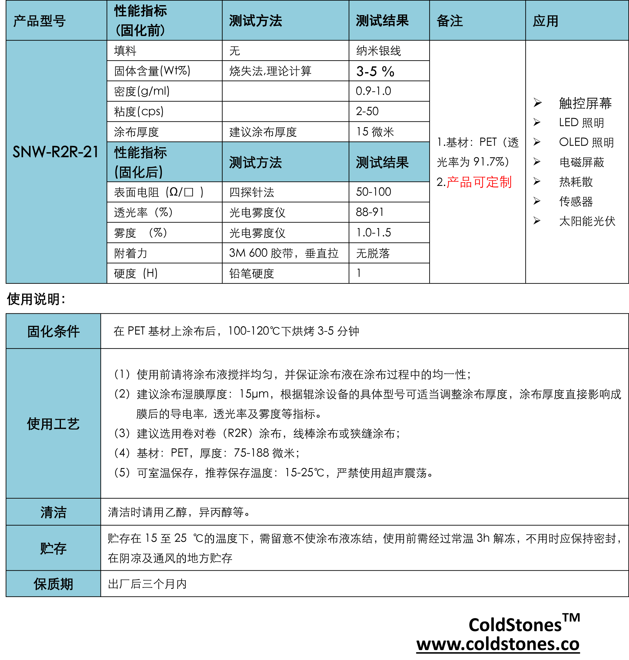 冷石科技专利技术生产的纳米银透明导电涂布液适合湿法涂布制程,可根据应用端具体要求实现客制化调配。该款涂布液可用辊涂(R2R)工艺制膜,且适用于 PET, PC,PEI, Glass等多种基材。